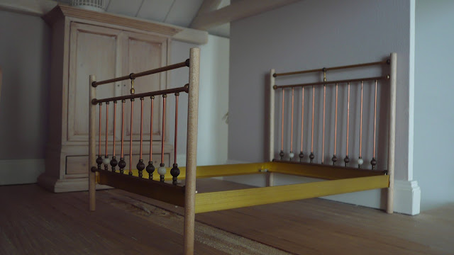 This has been a long time in the making and gathering of materials. I had to measure and cut all the tubing by hand with a file, and then mark and drill all the holes by hand. I could not have done this without my vice. I haven't yet worked out exactly how much I spent, probably about £30- £40. It isn't exactly 1:12 scale. It measures 14.5 (l) x 11 (w) x 11 (h) cm. So if in the real world, its just over 5 1/2 feet long. I decided to make it shorter and slightly smaller than a double, but bigger than a single, so it wouldn't cramp the room too much. The materials for the bed frame are brass and copper tubing, angled brass, crimp beads, various metal beads, gold ear bullets, 1:12 scale brass door knobs, 1:12 scale castors and two small turned pieces of brass I bought from a model ship website. It's all held together with tiny copper tubing dowels in hand drilled holes (I used a small drill bit held in an Excel blade handle), using superglue and araldite. The mattress is also handmade, it had to be, since the bed isn't "standard". I bought the material on Ebay (Piglets Pincushion). It is hand sewn together, stuffed and buttoned ( no buttons though, I used crochet thread). I kept the edges rigid by using lengths of acetate sewn inside, before it was turned inside out for stuffing and "buttoning".